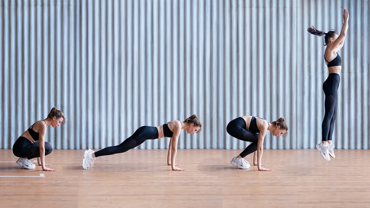 6. Finaliza com um salto explosivo ou, se for iniciante, um toque dos dedos no teto. Começa com 5 a 10 burpees e aumenta gradualmente.